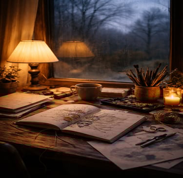 The finished piece may hang on a wall, live in a journal, sit in a drawer, exist on a screen, or disappear entirely. But the act itself leaves a mark. It can soften what was hardened. Clarify what was tangled. Reveal what was hidden. Return us to ourselves when we have drifted.